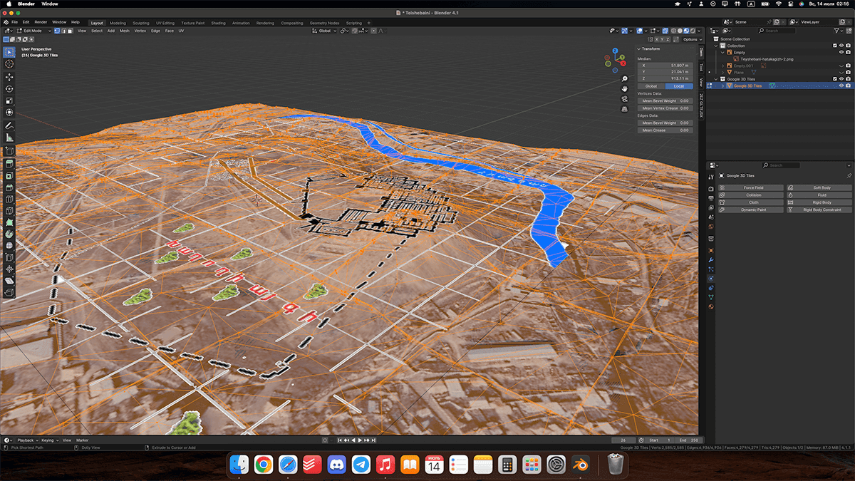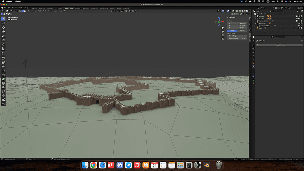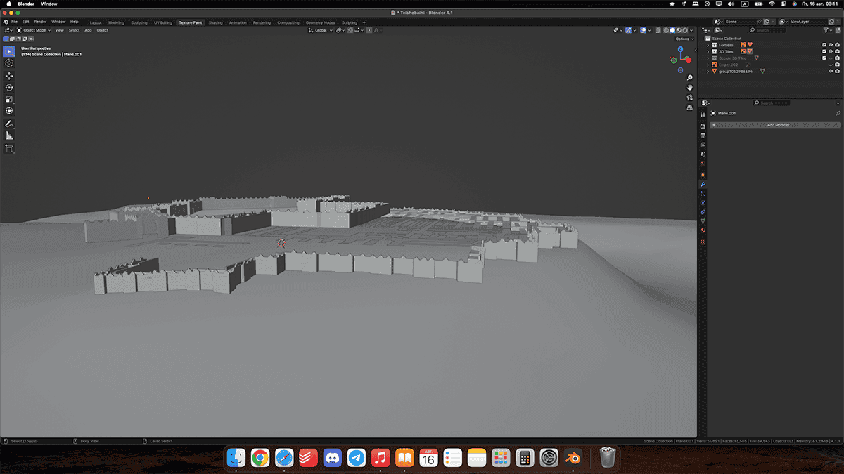 Accurate topography is the backbone of any historical reconstruction. We began by importing hi-res orthophotos and elevation data of Karmir Blur into Blender. The raster files were converted into a dense mesh that preserved every ridge and slope. After validation against excavation trench maps, the mesh was decimated and retopologized to a low-poly LOD for real-time use, then exported as .gltf.