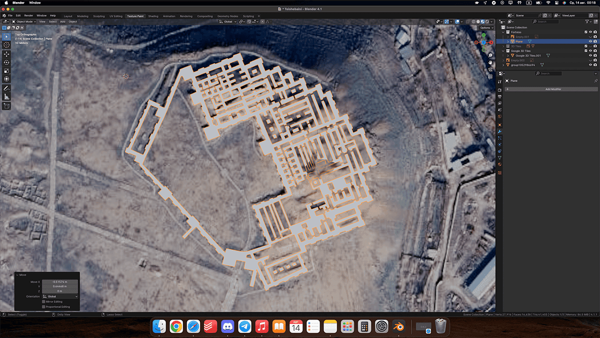 The published excavation blueprint—walls, courtyards, storage rooms—was traced into a clean 2-D vector inside Blender. Treating this vector as a live reference layer let us snap 3-D assets precisely to historical coordinates while keeping iteration fast.